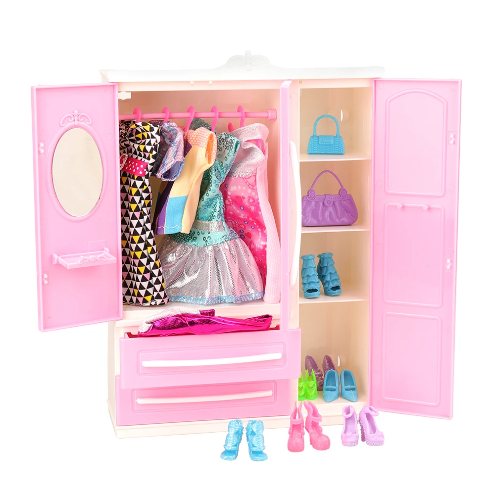 36 Items =1 X Wardrobe +5 X Dresses +10 Bags +10 Shoes +10 Hangers Dollhouse Accessories For Barbie Dolls 1/12 Chinese Furniture