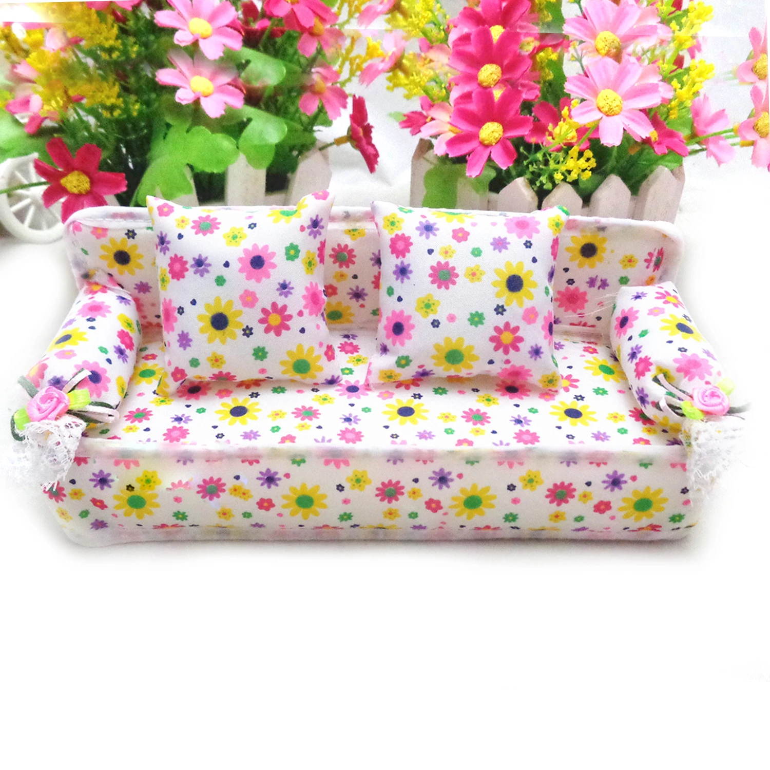 Gallery for Kids Mini Doll Flower Print Sofa Miniature Dollhouse Couch Furniture with 2 Cushions Pillows Accessories for Barbie Doll Toy